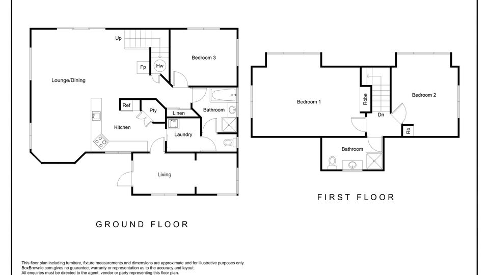 Accommodation is spread across both levels, with three generous bedrooms (two upstairs, one downstairs) complemented by two bathrooms, one on each floor. The upstairs bedrooms enjoy the light and space of pitched ceilings, while the ground-floor bedroom offers practical versatility for family living.