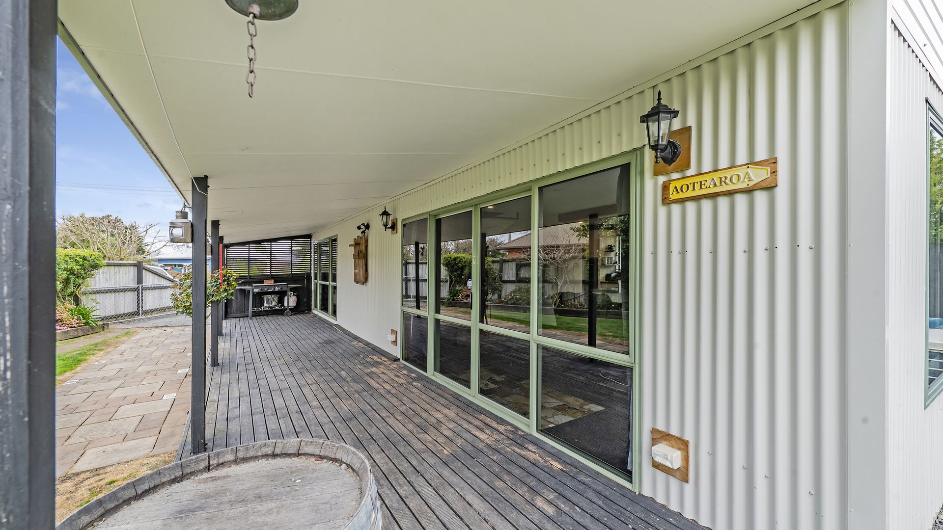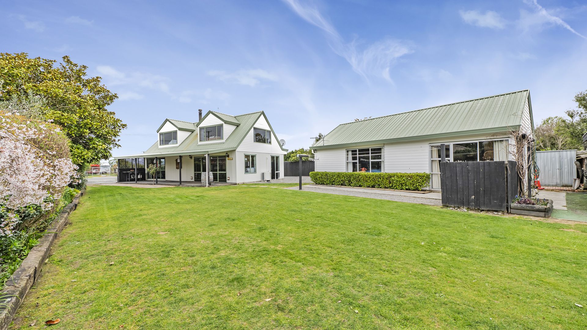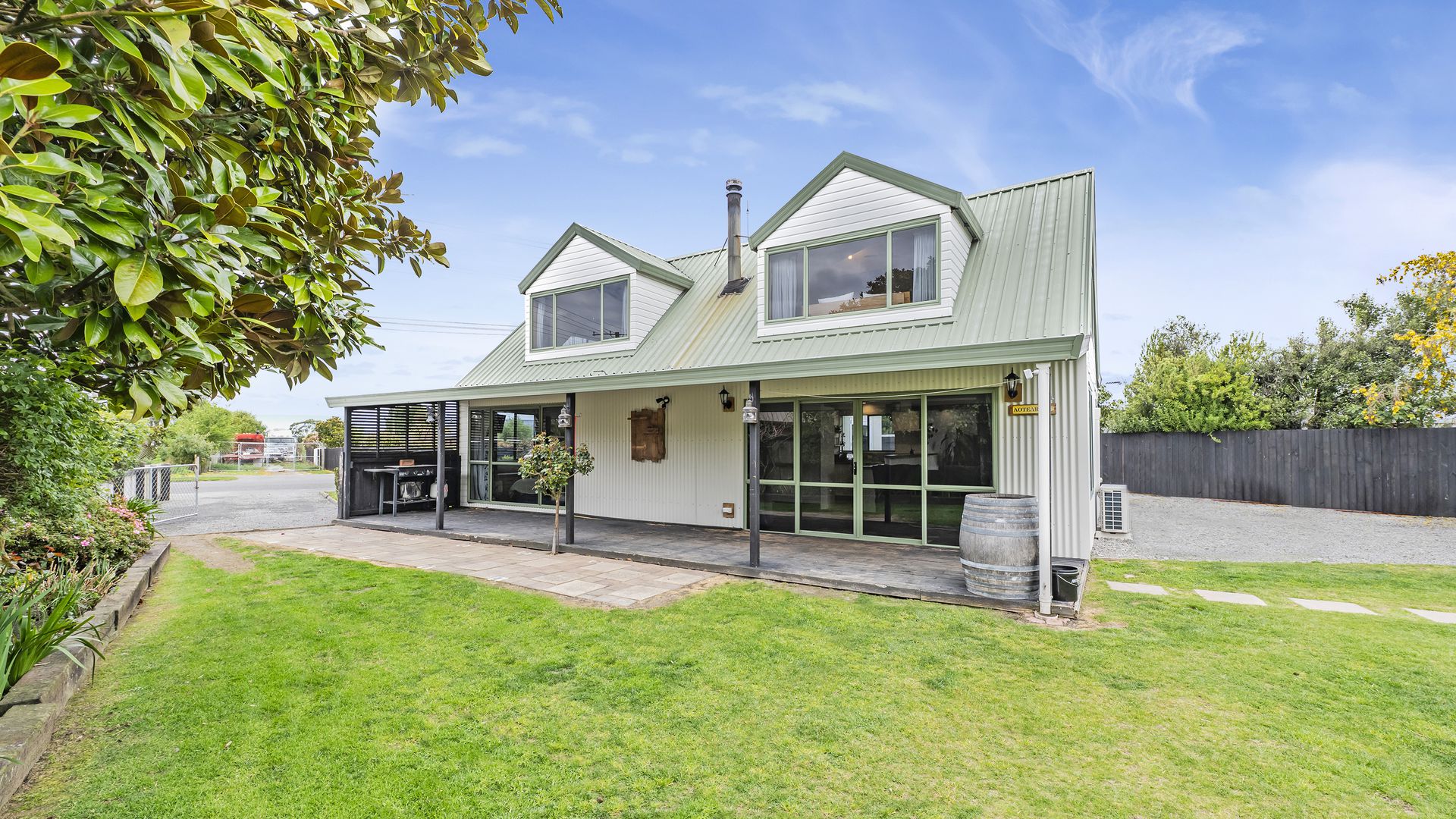 The kitchen sits at the heart of the home, flowing seamlessly into the open-plan dining and lounge area. A log burner and heat pump ensure comfort year-round, while exposed beams add character to the light-filled interior. A versatile second room off the kitchen offers options as a media space, home office, or guest retreat. Sliding doors open to a sun-soaked deck and covered veranda – perfect for entertaining or relaxing in privacy.