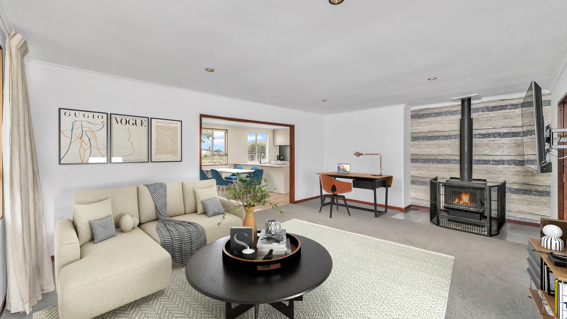 A log burner ensures cosy winters and relaxed year-round comfort, giving the home a warm, inviting feel whatever the season.